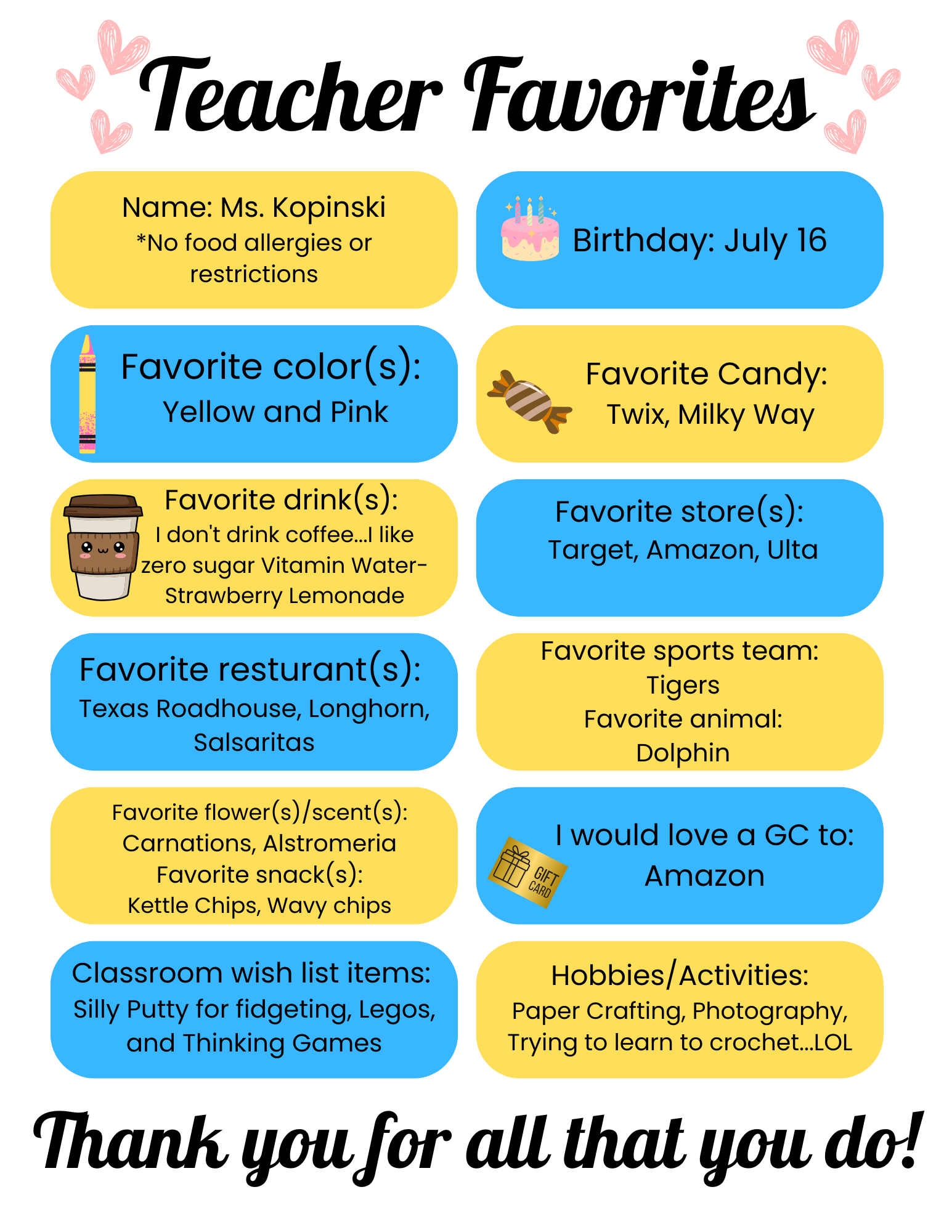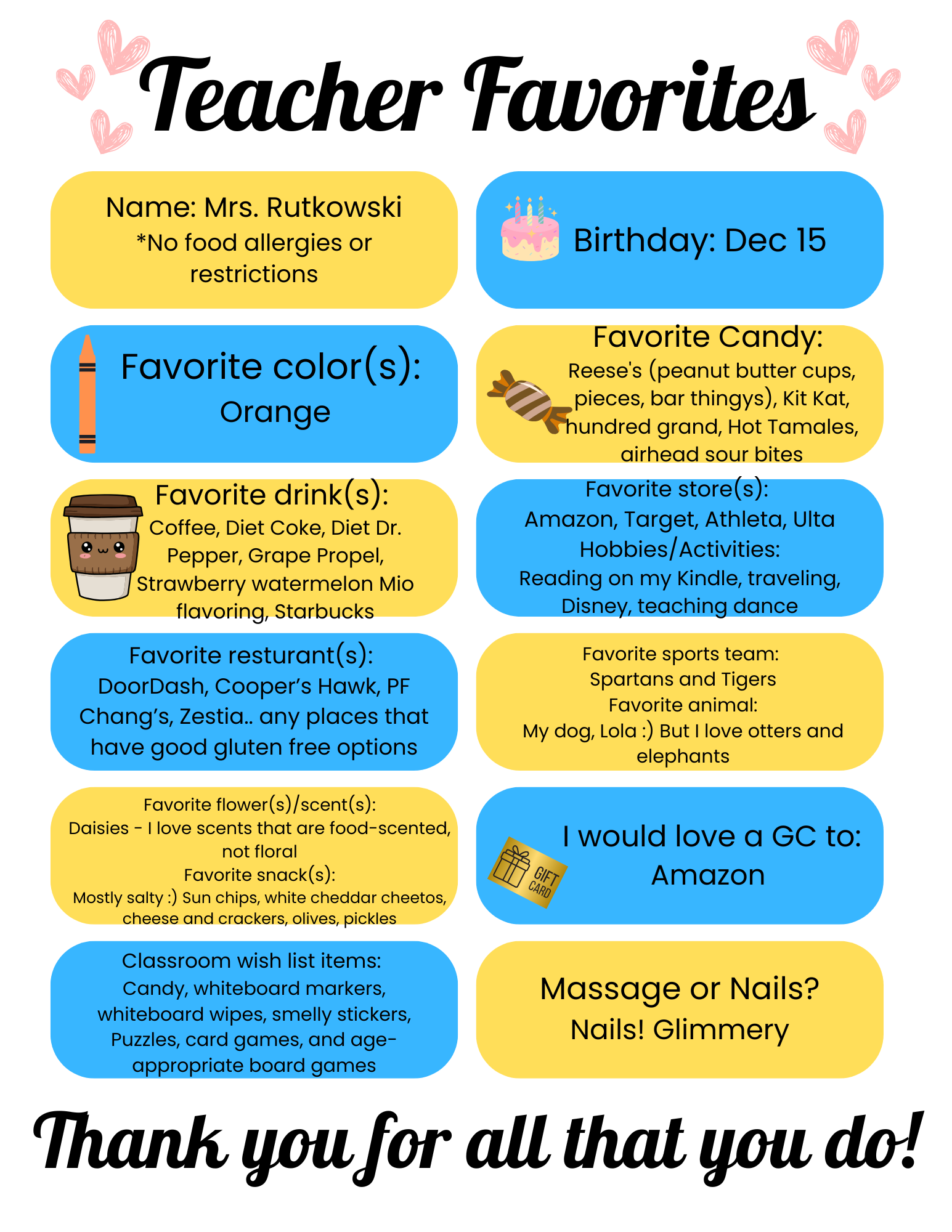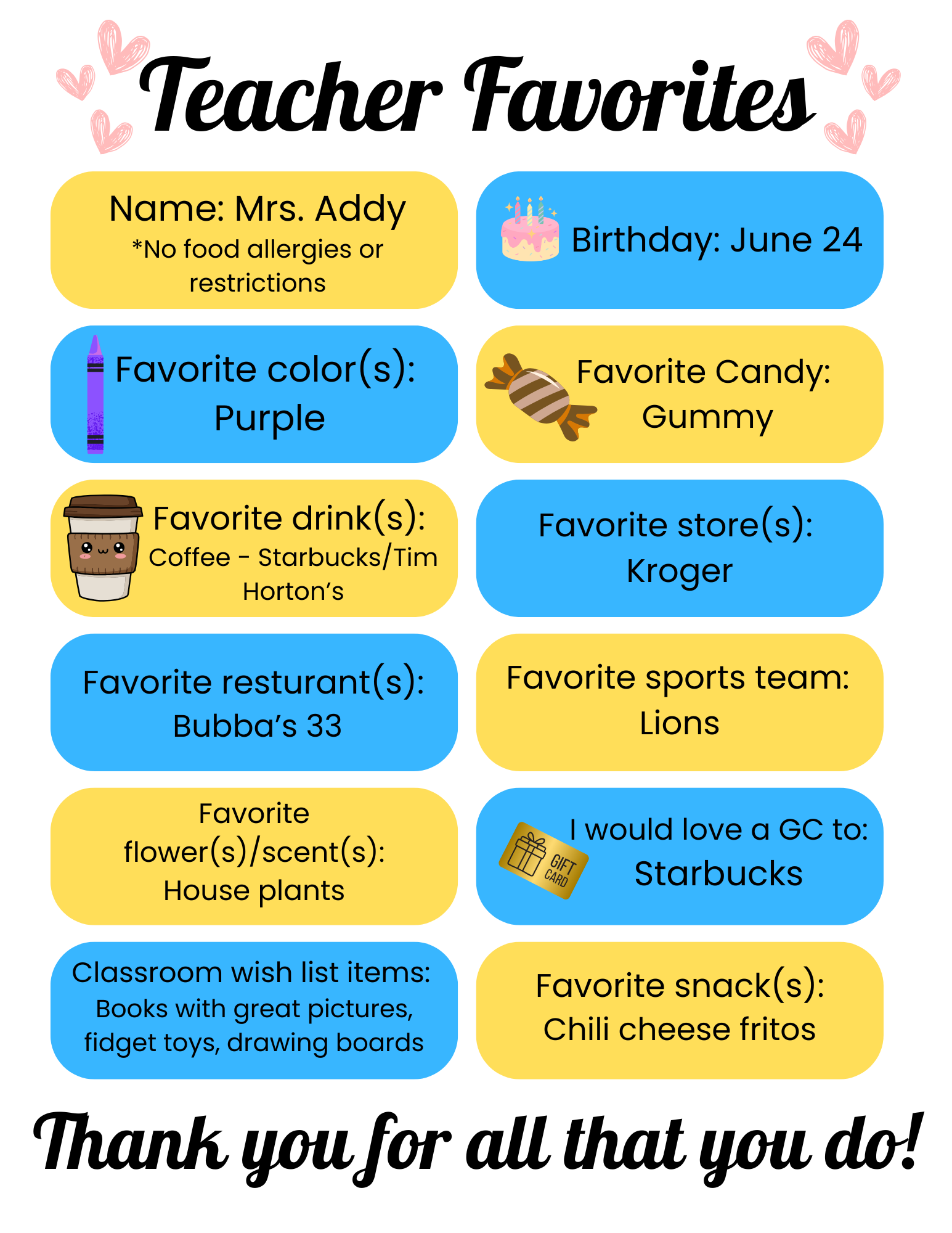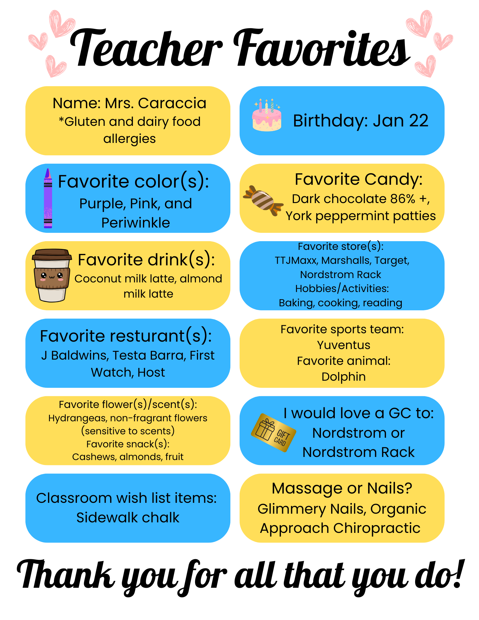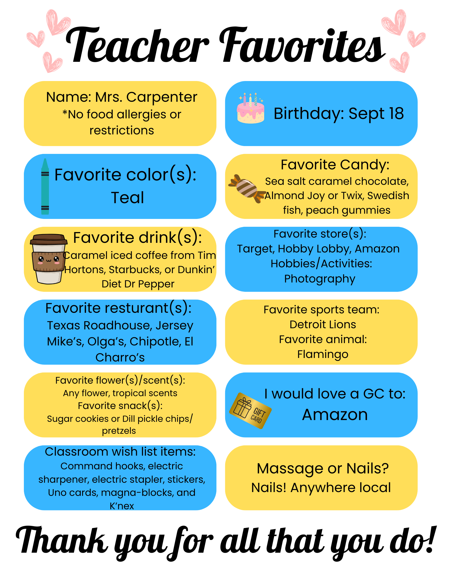 Want to show appreciation to our amazing teachers and staff? We've gathered their favorite things—everything from snacks and drinks to hobbies and gift card preferences—to make gift-giving or small acts of kindness easy and meaningful. Click the links below to view each staff member’s favorites and help us spread joy throughout the year!