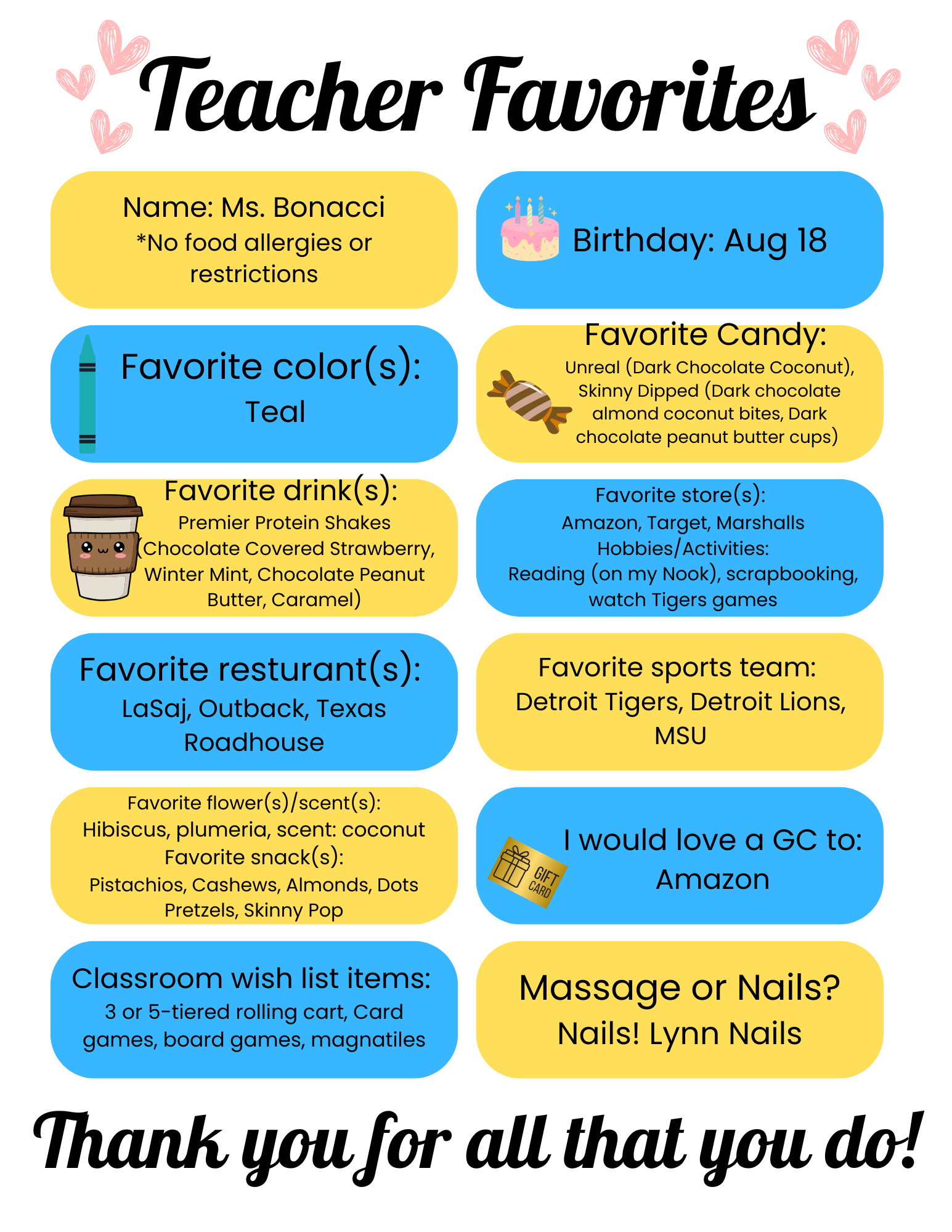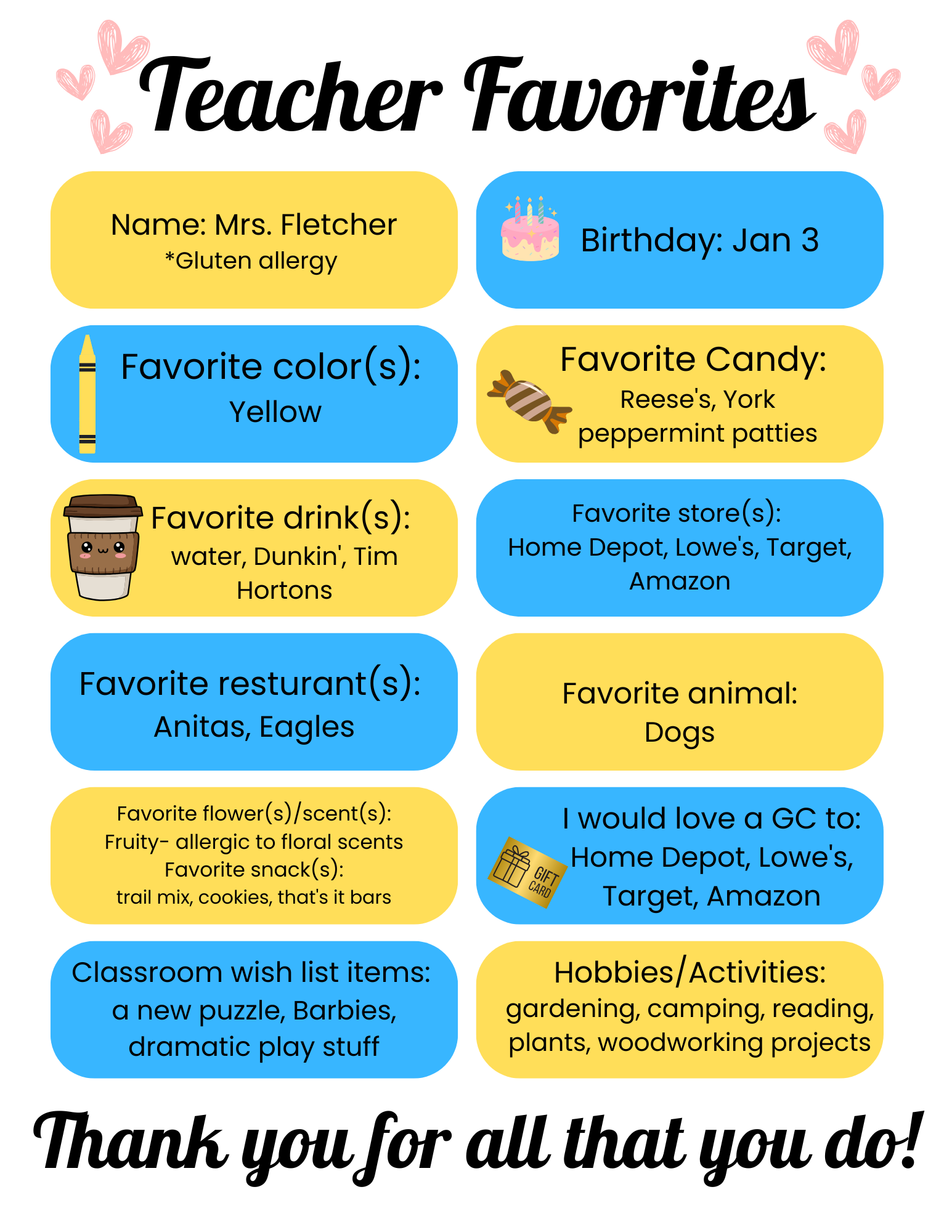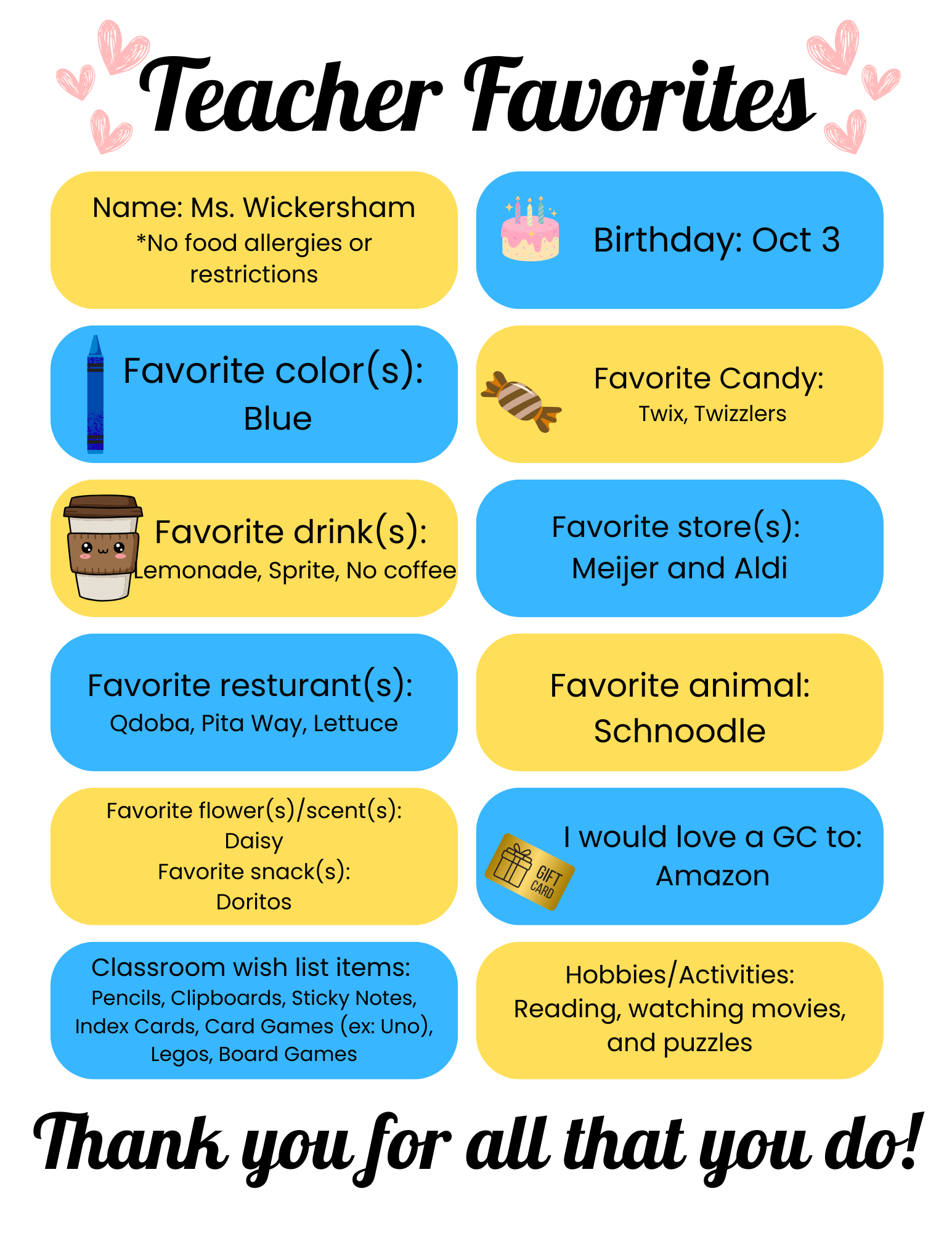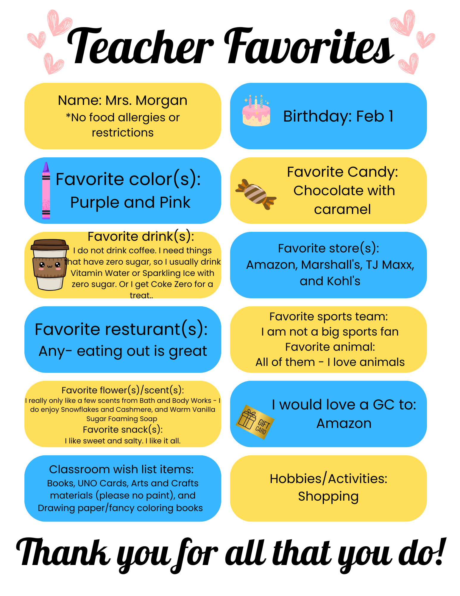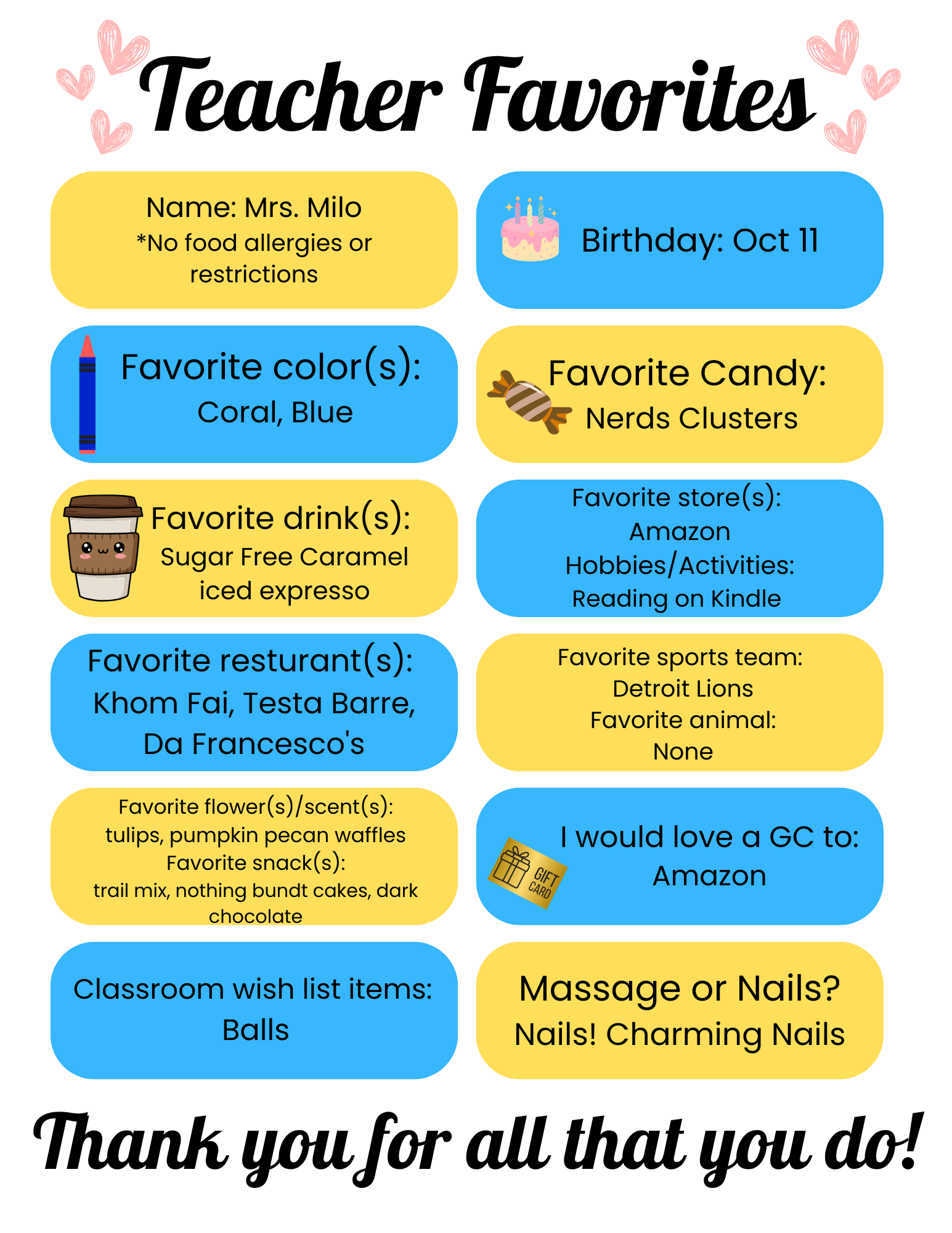 Want to show appreciation to our amazing teachers and staff? We've gathered their favorite things—everything from snacks and drinks to hobbies and gift card preferences—to make gift-giving or small acts of kindness easy and meaningful. Click the links below to view each staff member’s favorites and help us spread joy throughout the year!