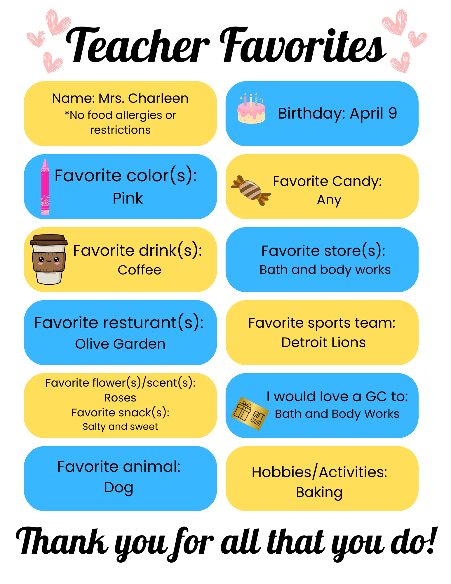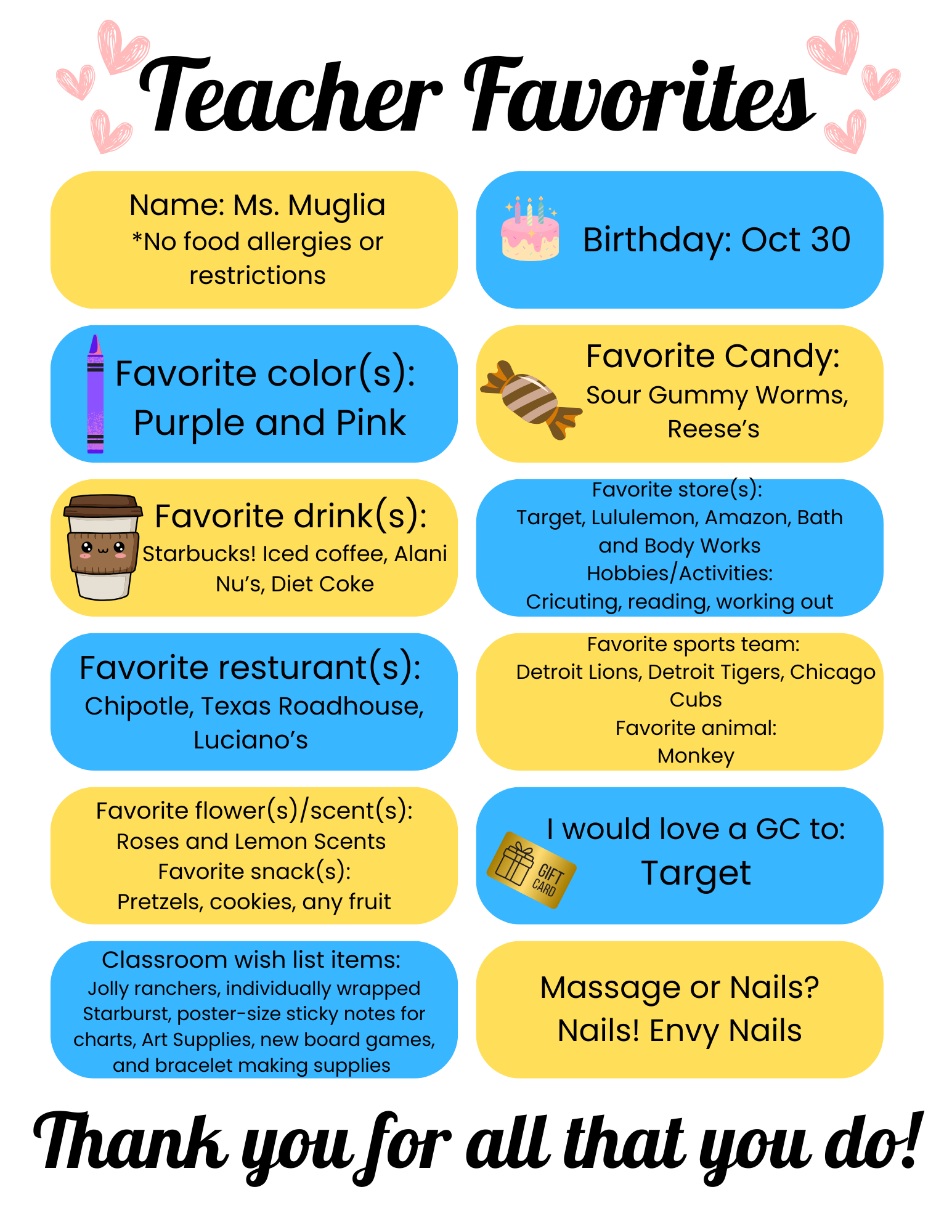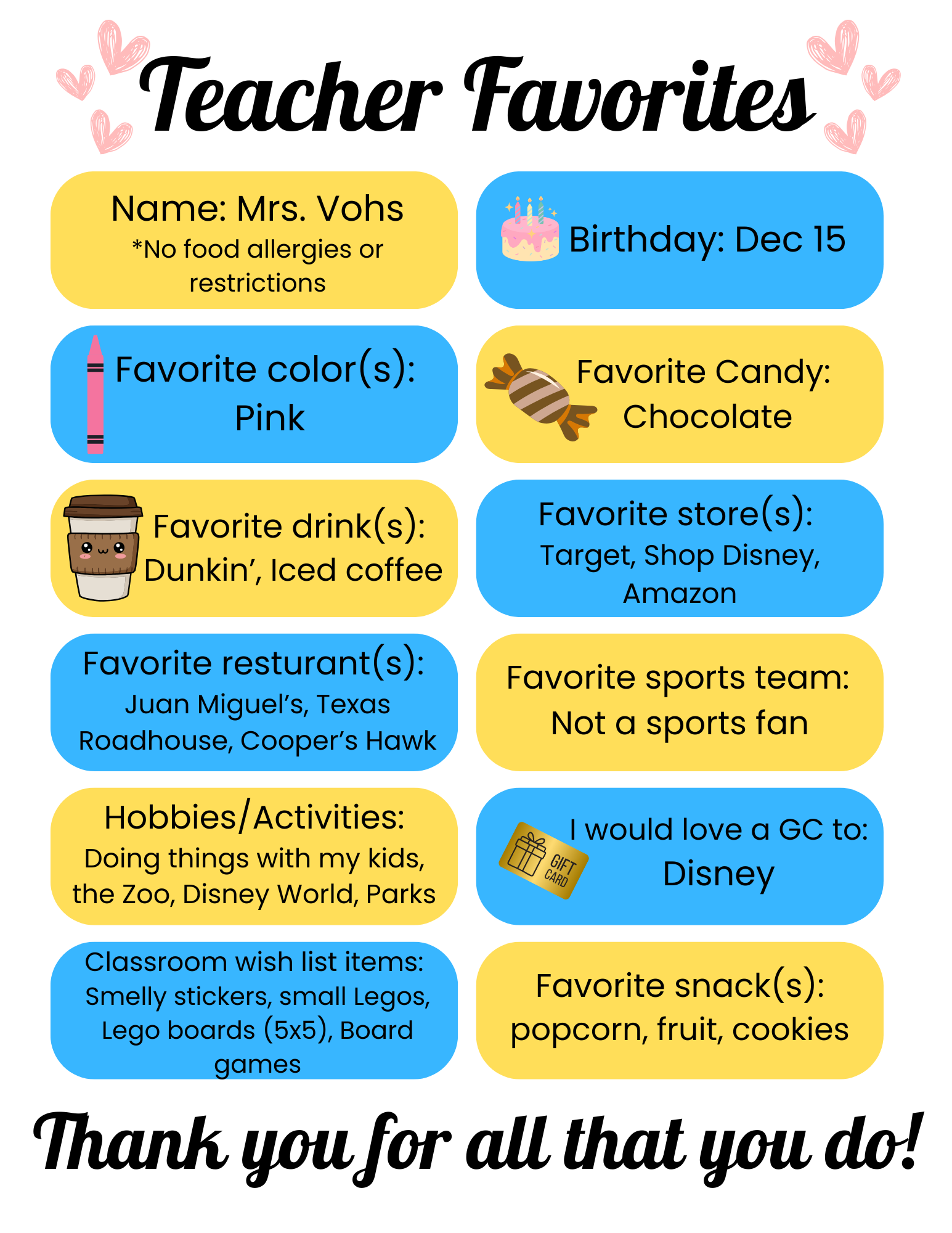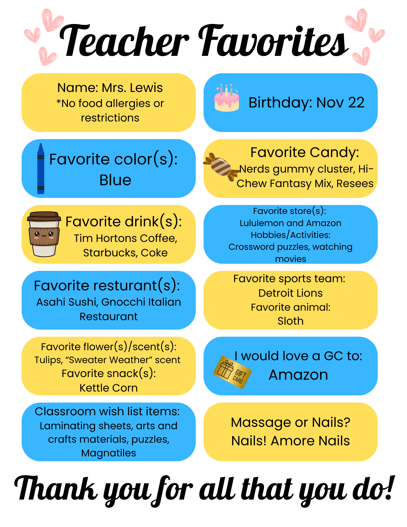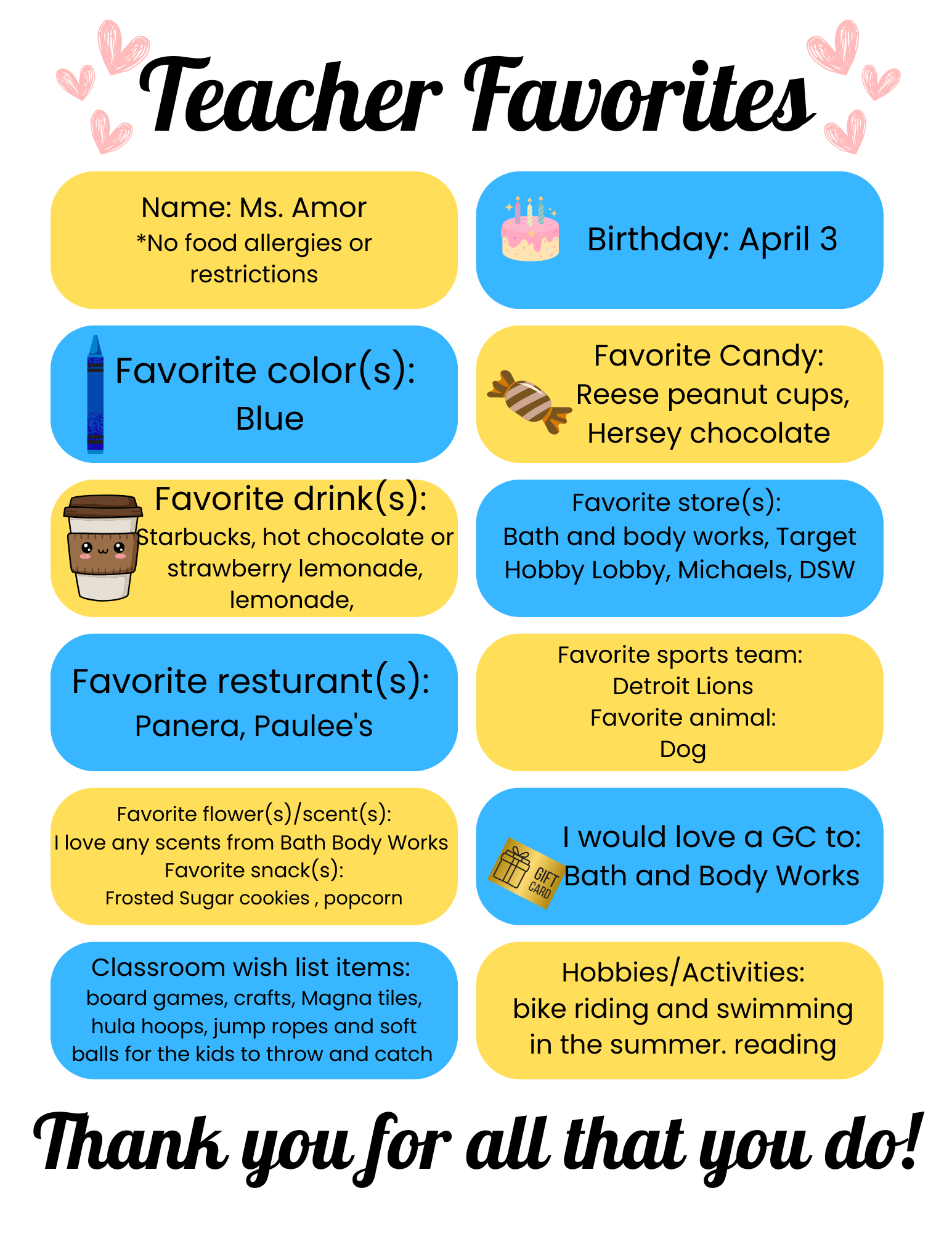 Want to show appreciation to our amazing teachers and staff? We've gathered their favorite things—everything from snacks and drinks to hobbies and gift card preferences—to make gift-giving or small acts of kindness easy and meaningful. Click the links below to view each staff member’s favorites and help us spread joy throughout the year!