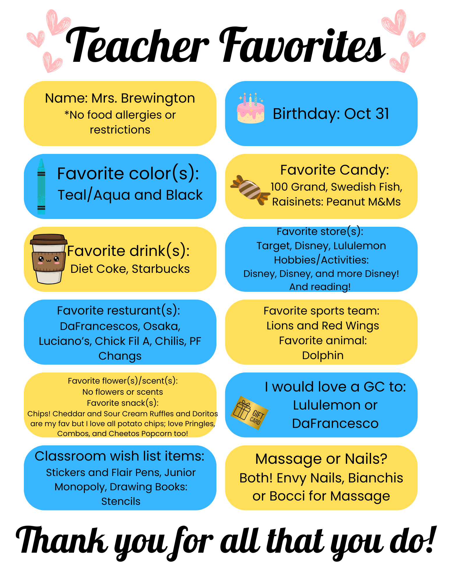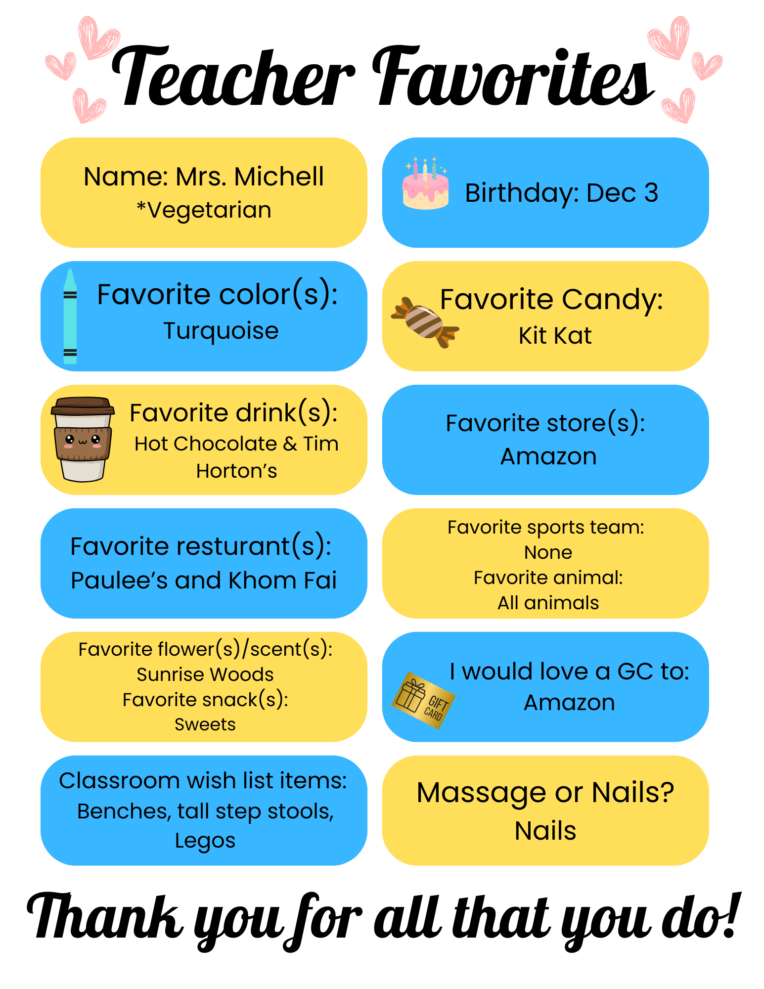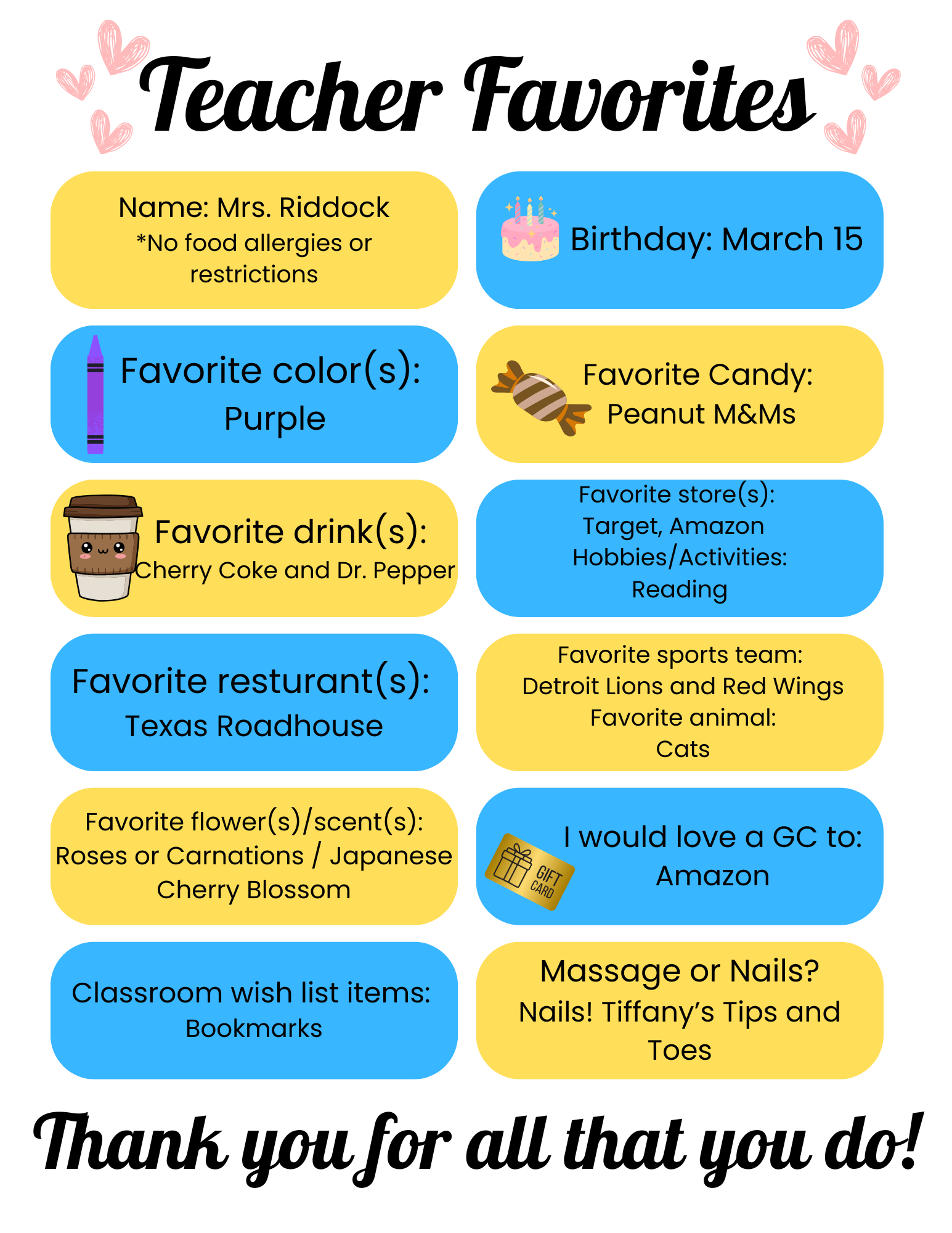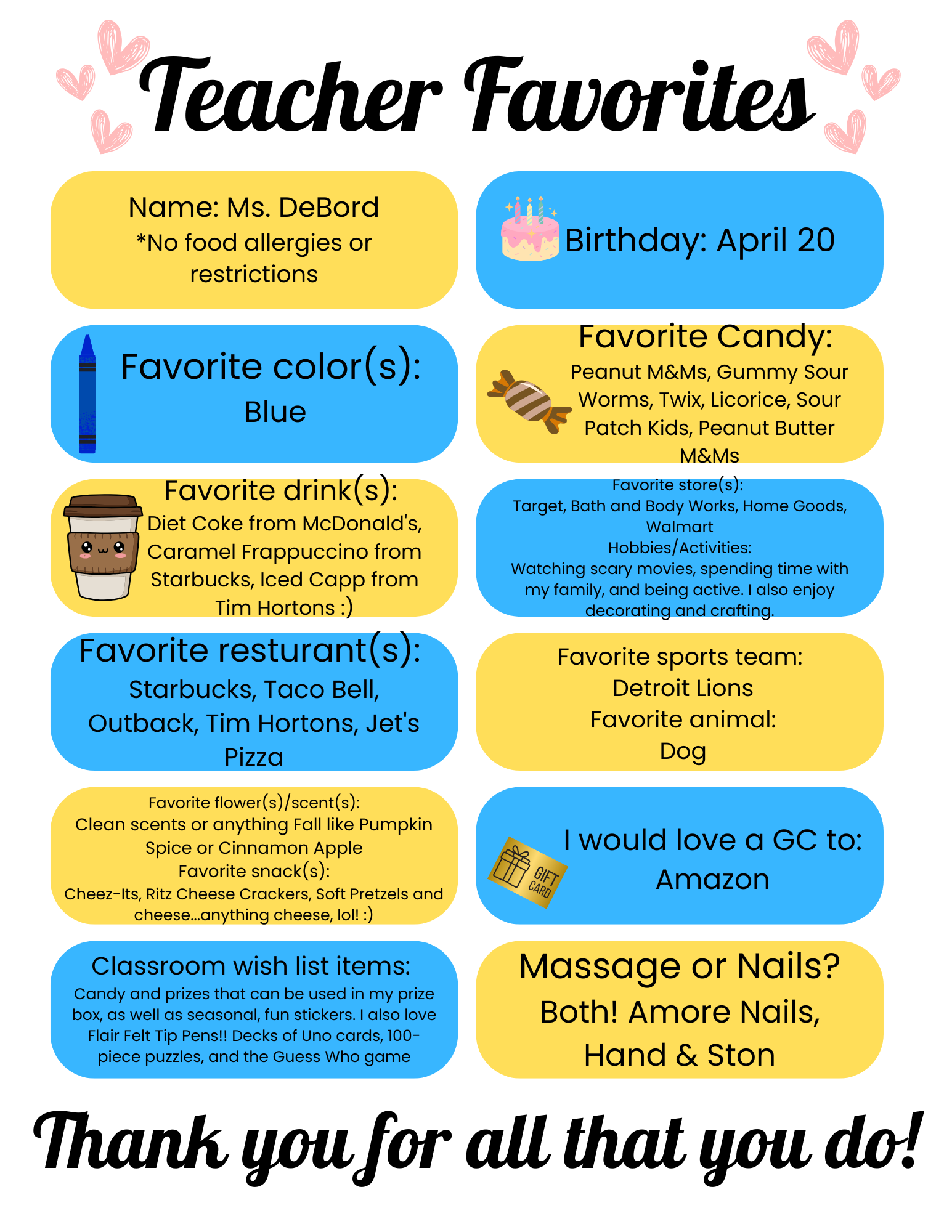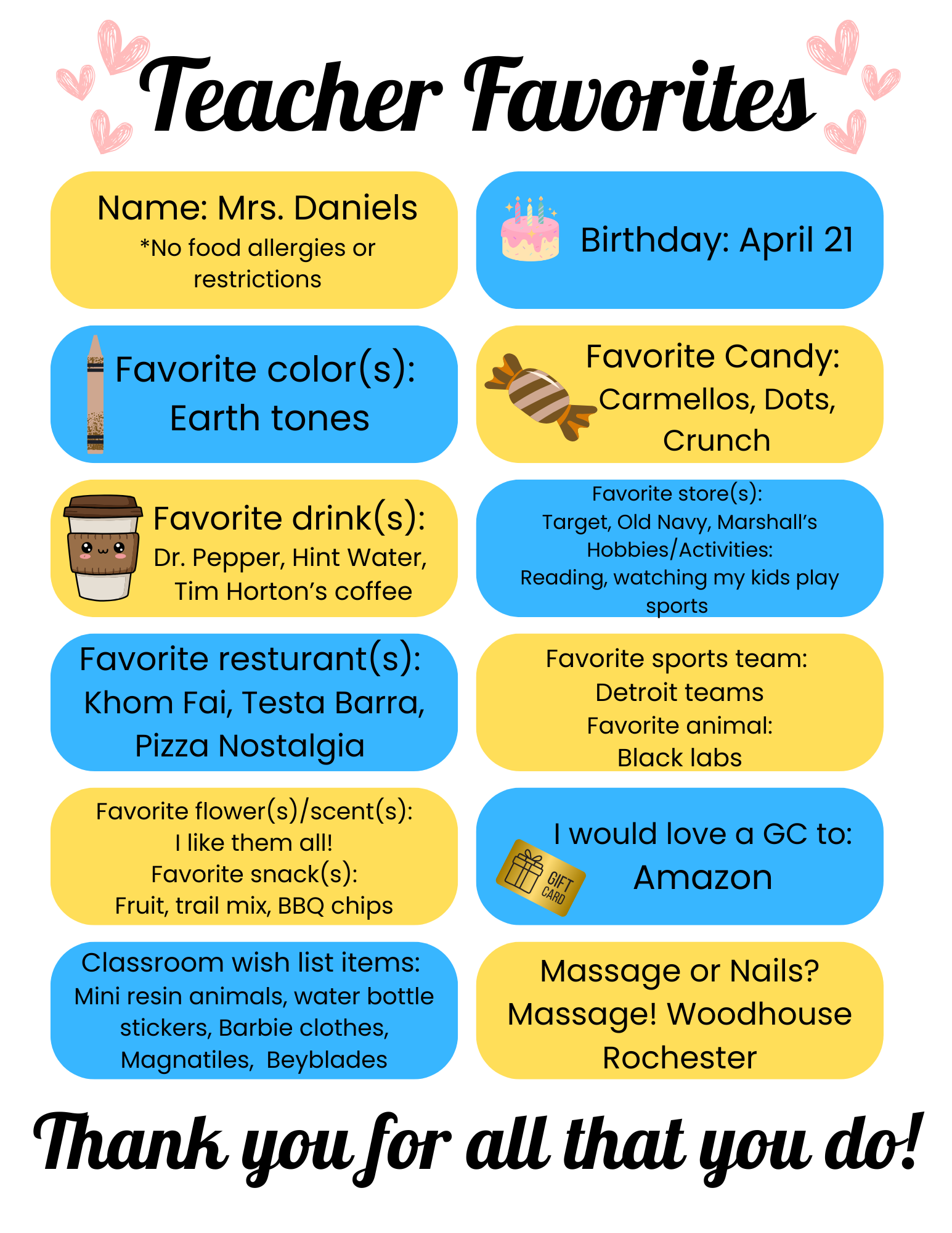 Want to show appreciation to our amazing teachers and staff? We've gathered their favorite things—everything from snacks and drinks to hobbies and gift card preferences—to make gift-giving or small acts of kindness easy and meaningful. Click the links below to view each staff member’s favorites and help us spread joy throughout the year!