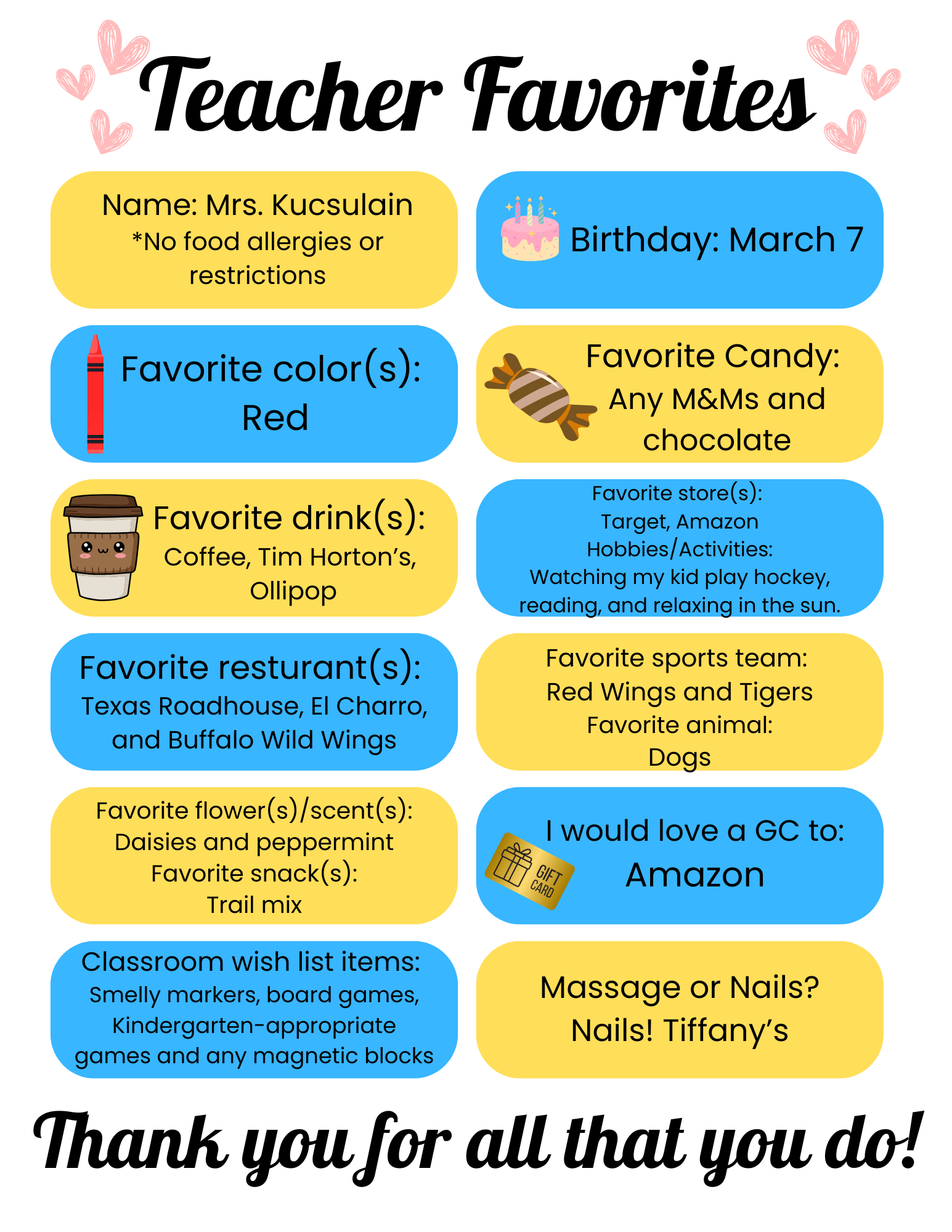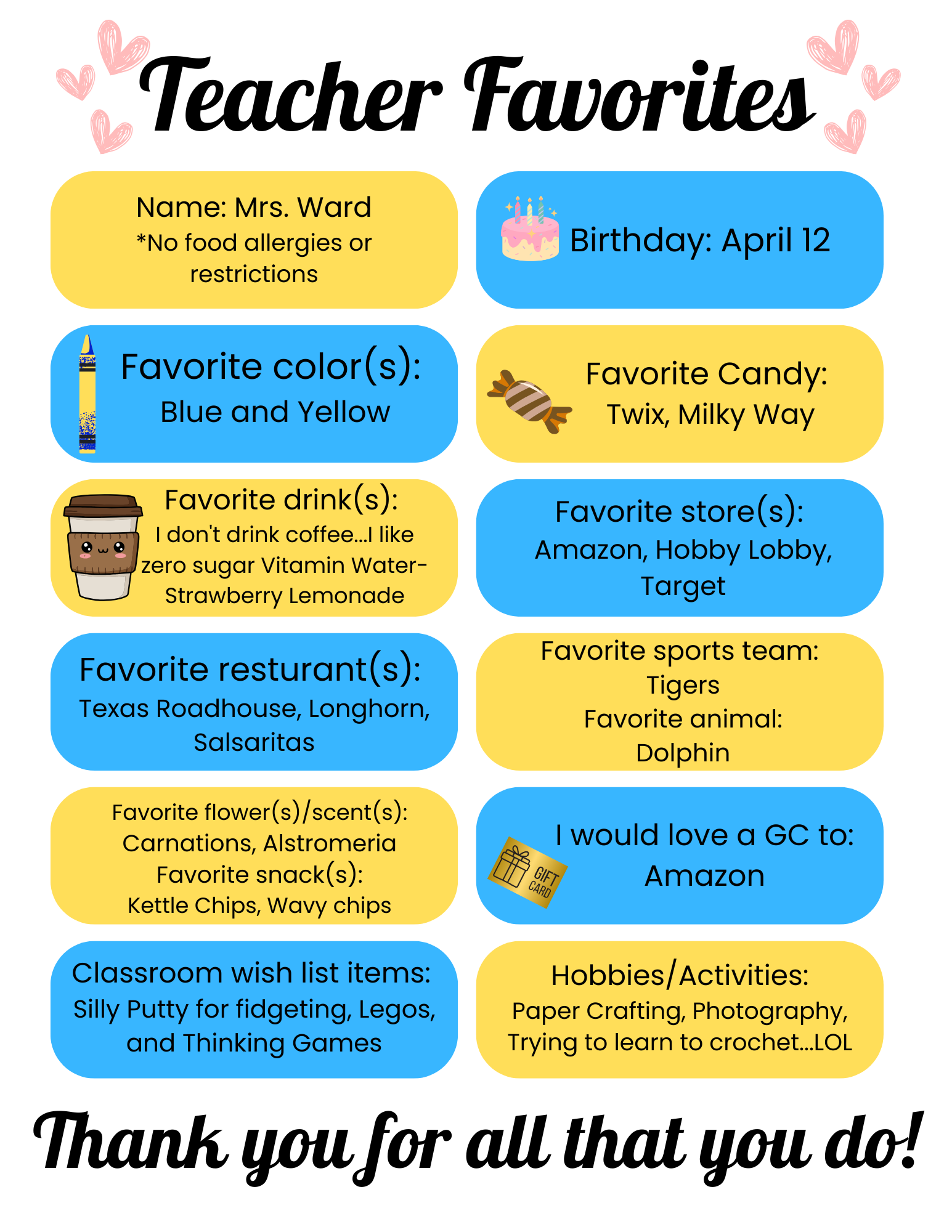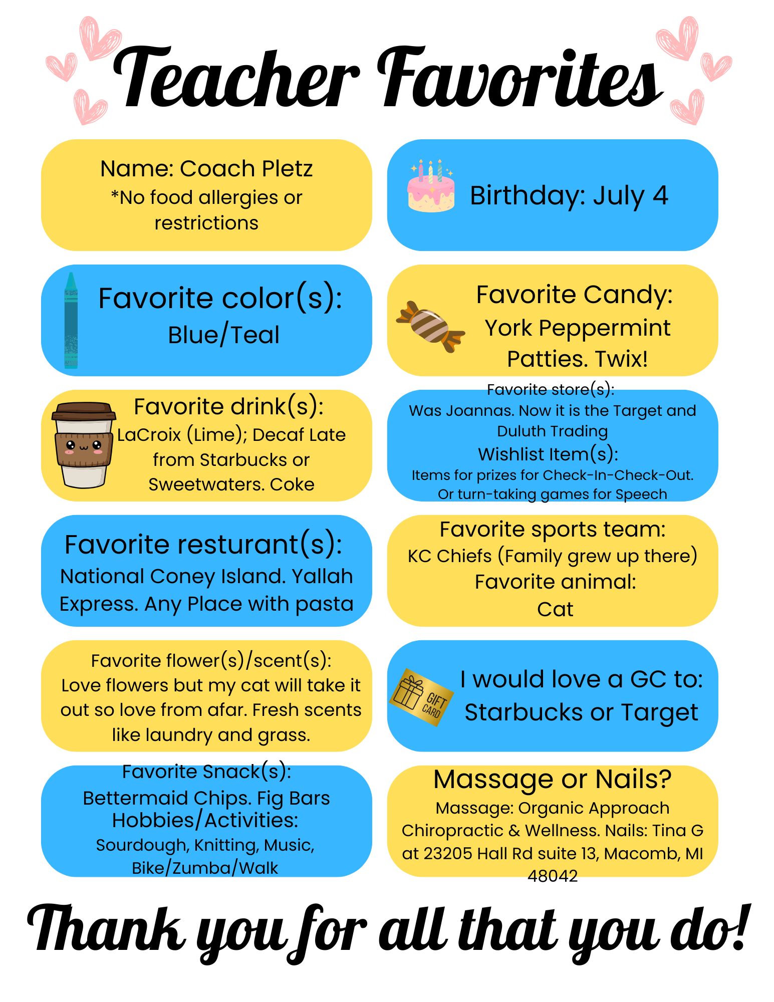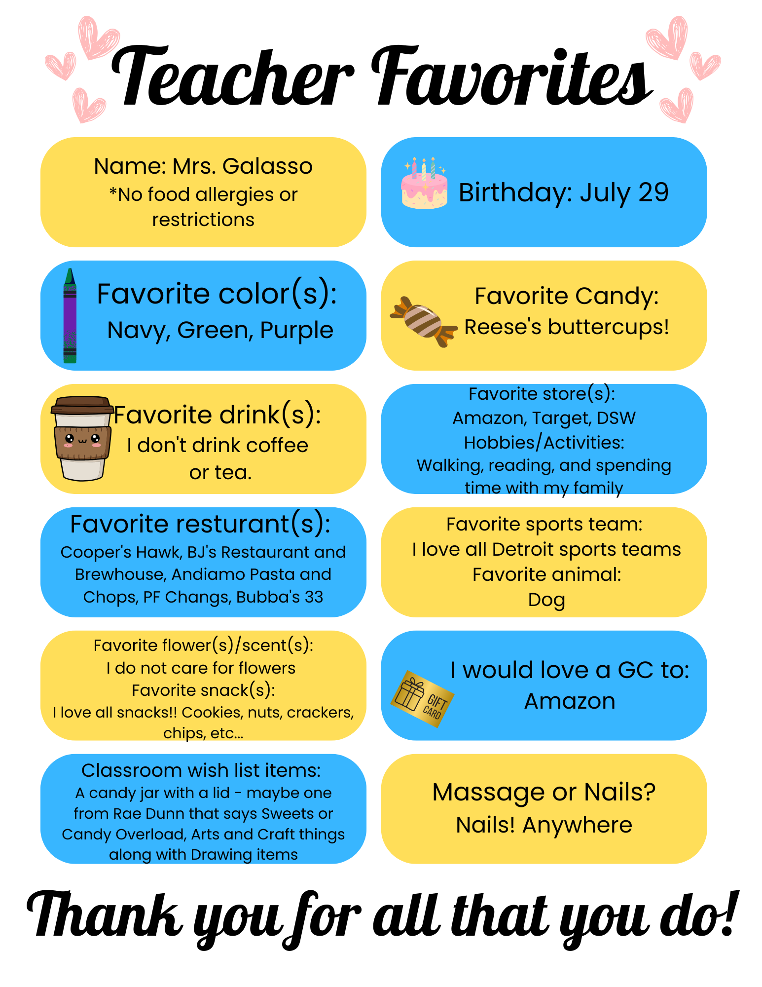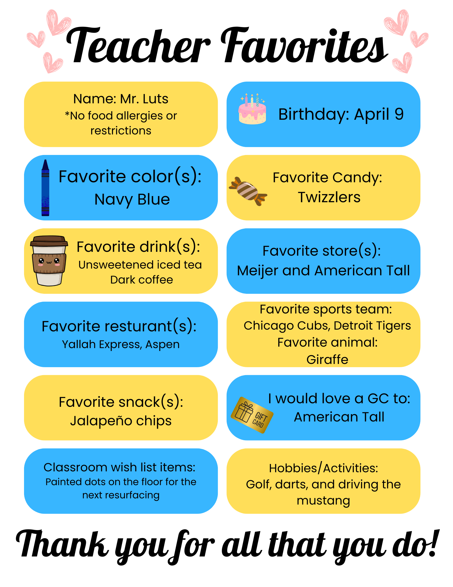 Want to show appreciation to our amazing teachers and staff? We've gathered their favorite things—everything from snacks and drinks to hobbies and gift card preferences—to make gift-giving or small acts of kindness easy and meaningful. Click the links below to view each staff member’s favorites and help us spread joy throughout the year!